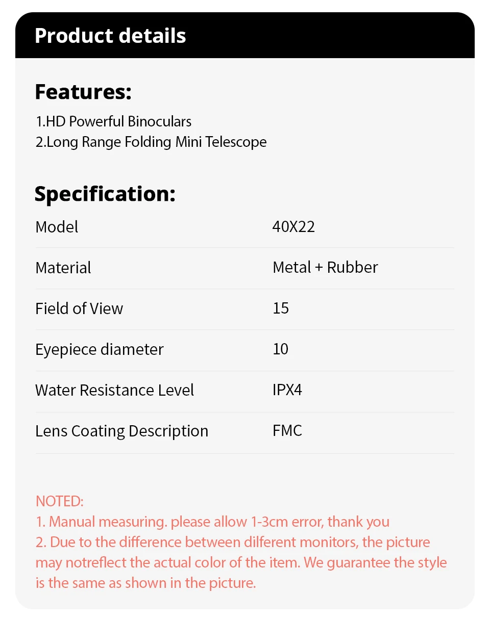 • Long-Range Viewing :With a range of 2000M, these binoculars allow you to spot distant objects and enjoy a wider field of view.